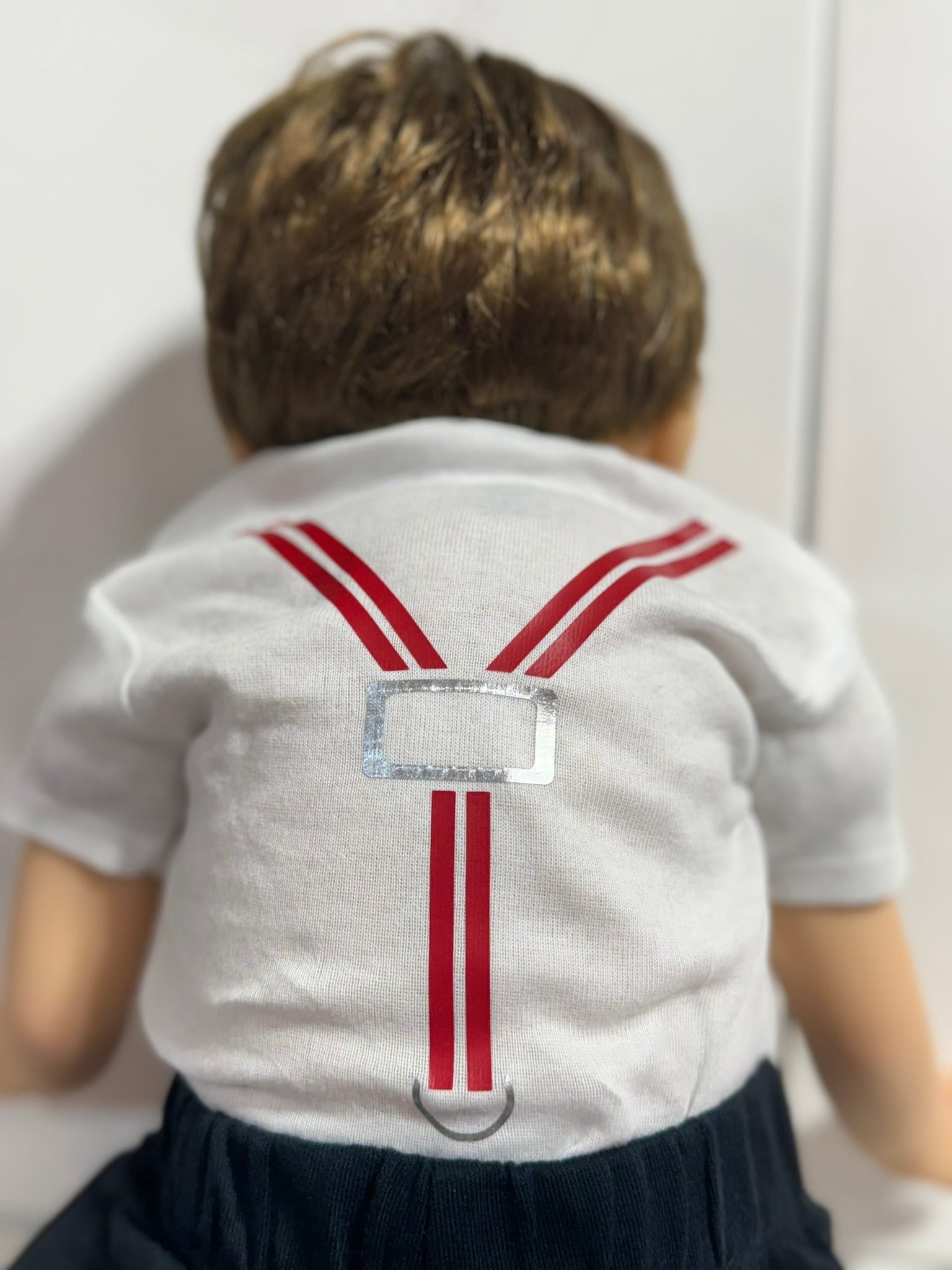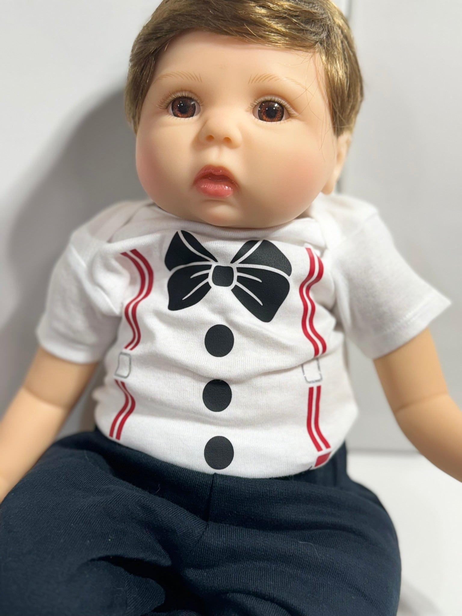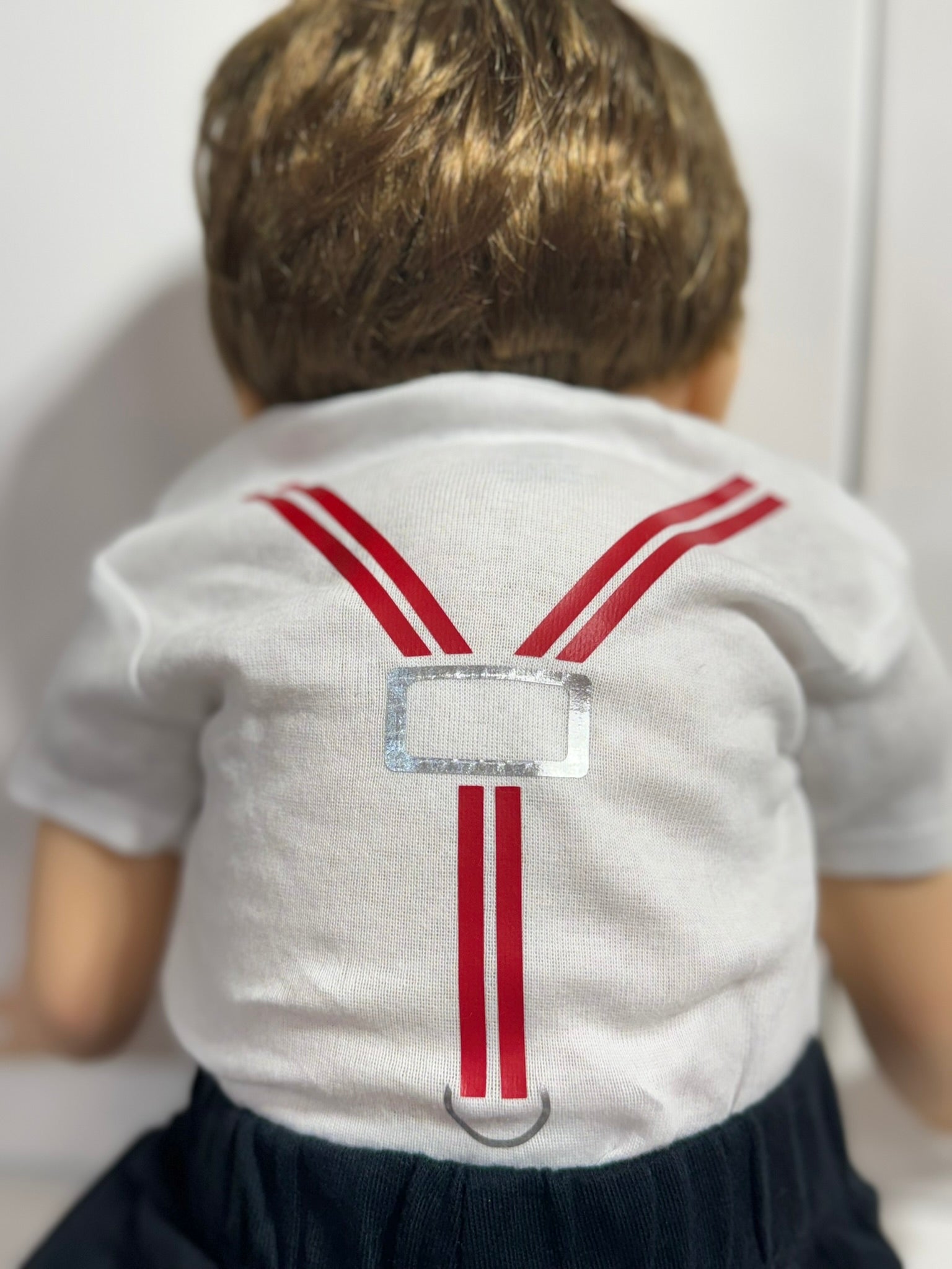 Dress your little one in style with our Dapper Baby Tuxedo Onesie! Perfect for special occasions or just to make everyday moments a bit more elegant, this adorable outfit features a charming printed tuxedo design. The black bow tie, buttons, and red suspenders add a touch of sophistication, while the soft, high-quality material ensures maximum comfort for your baby. Easy to wear and even easier to love, this onesie is a must-have for any fashionable baby wardrobe. Let your baby steal the show with their impeccable style!