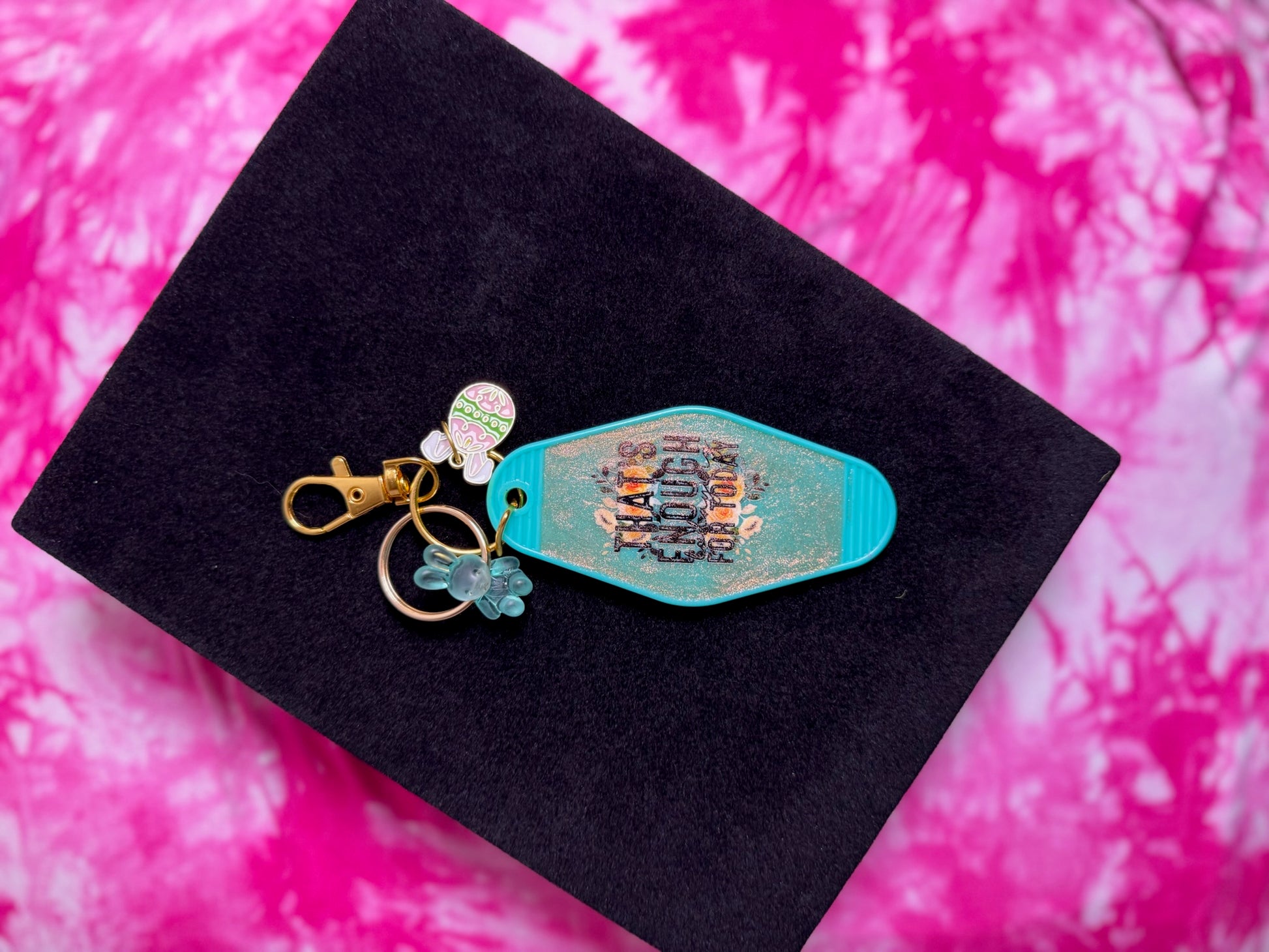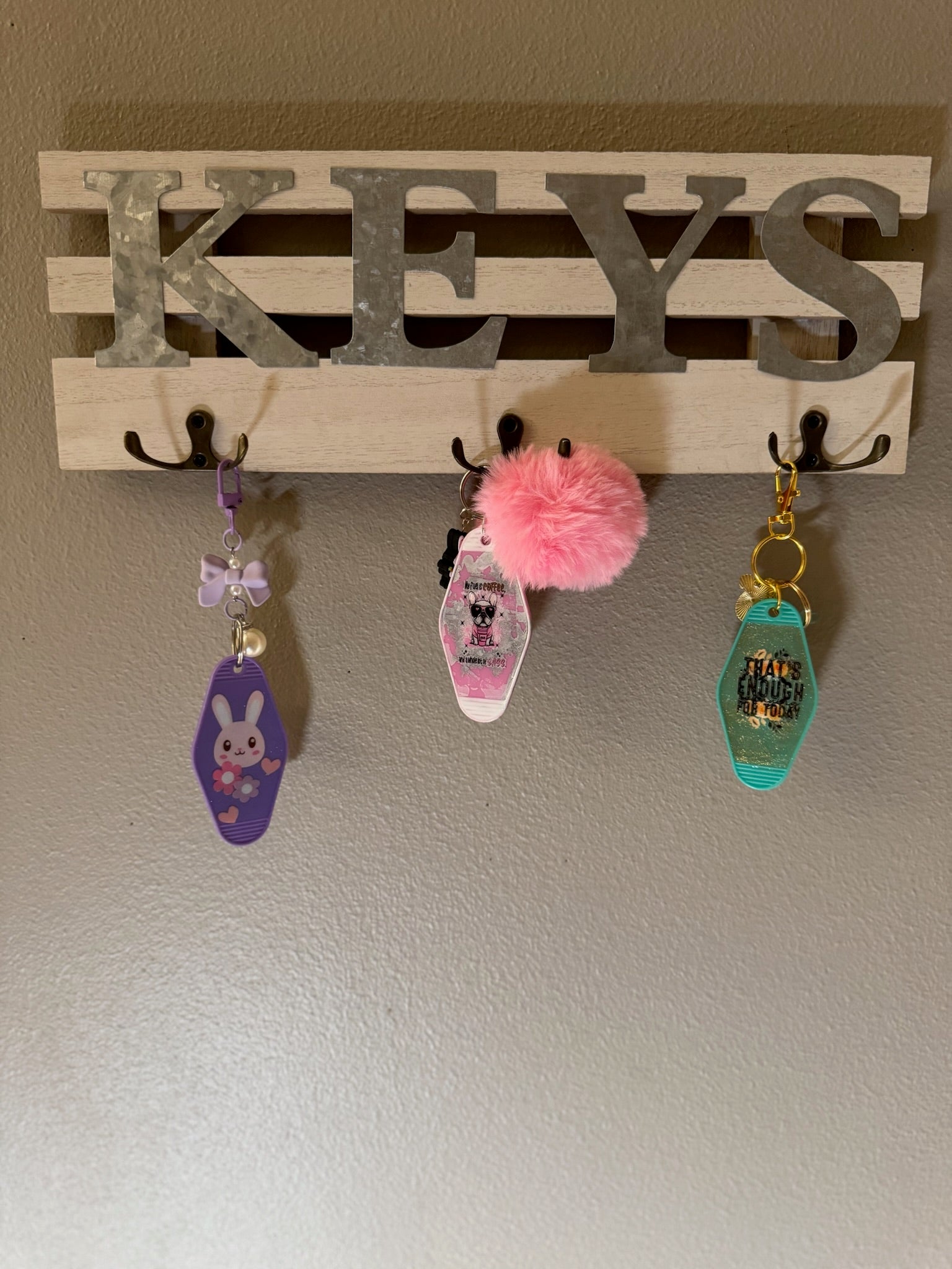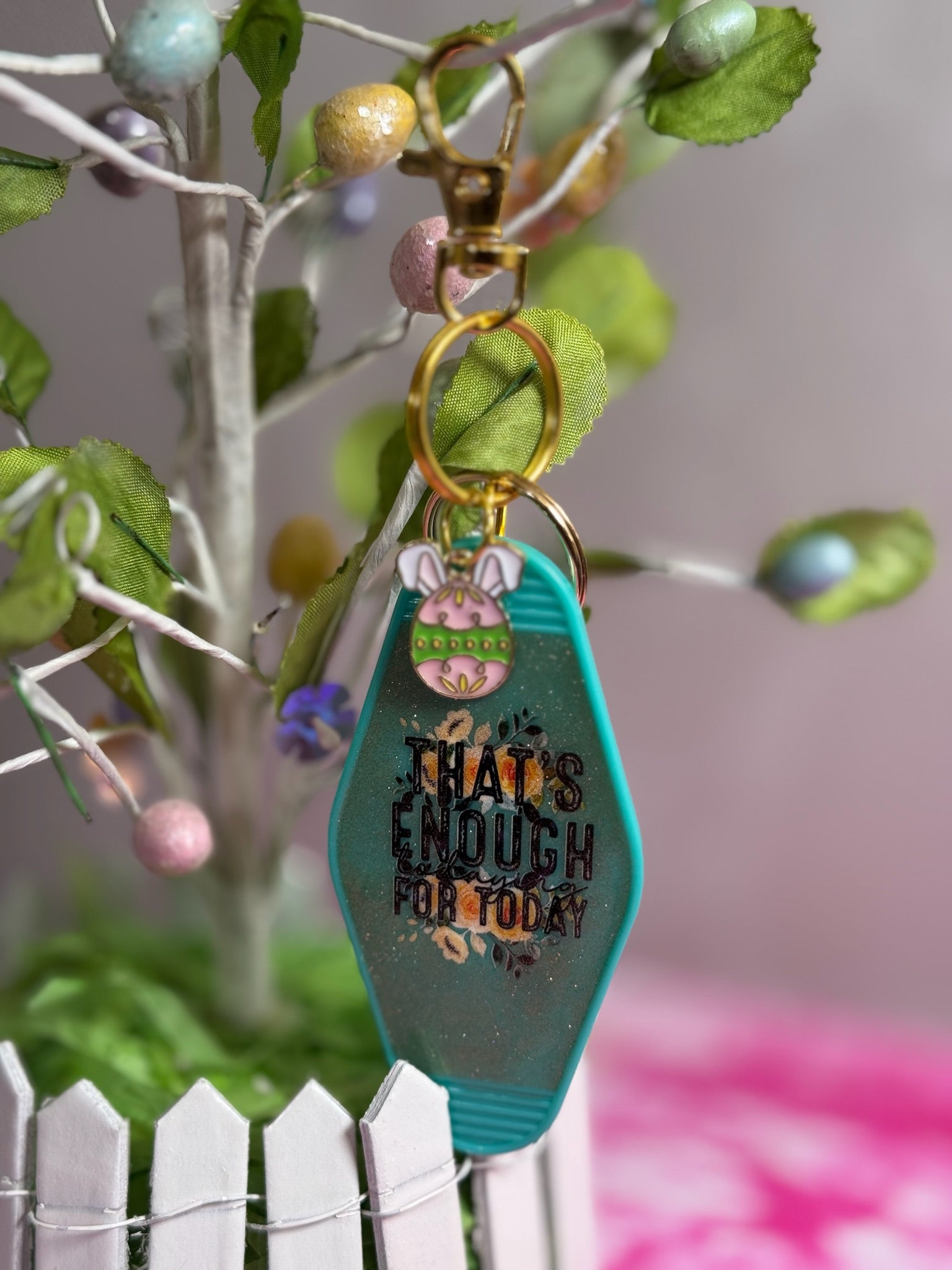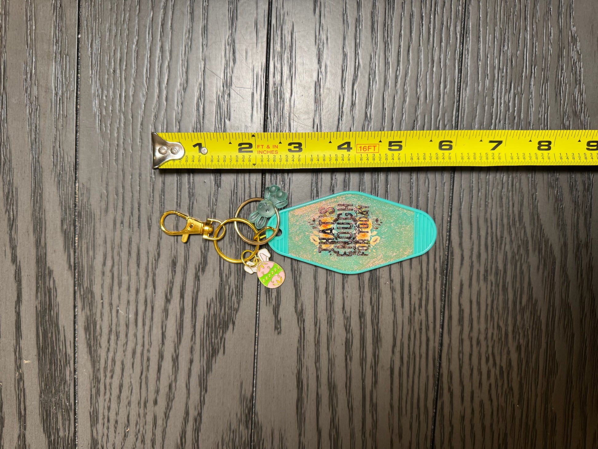 This vintage-inspired motel keychain is for those moments when you’re over it but still keeping it cute. Featuring a playful retro font, a touch of sparkle, and a bold teal hue, this keychain says "Feeling IDGAF-ish Today" on the front, while the back offers the perfect reminder: "That's enough for today." Because let’s be real—you’ve done your best, and that’s more than enough.