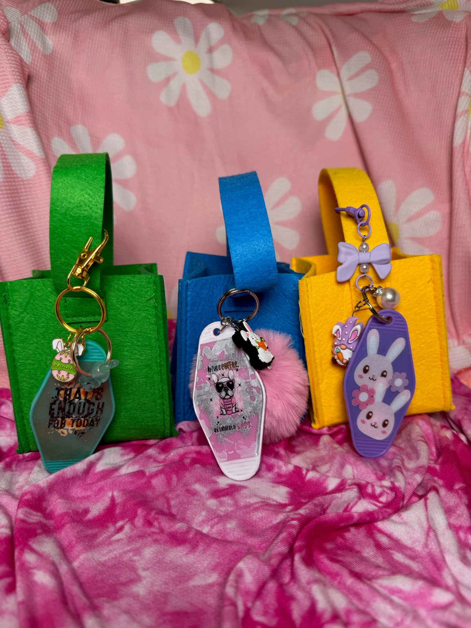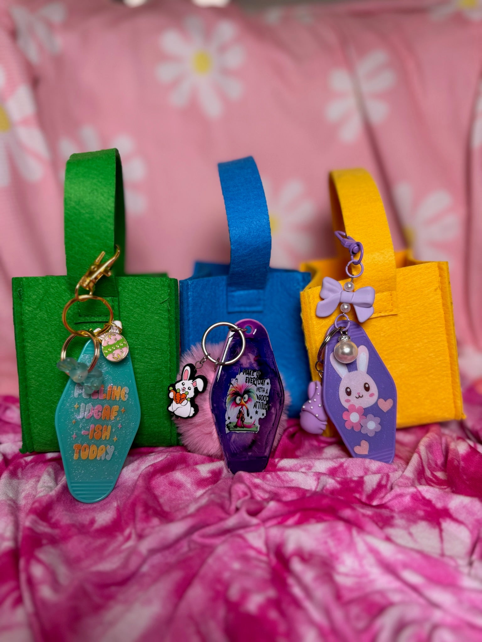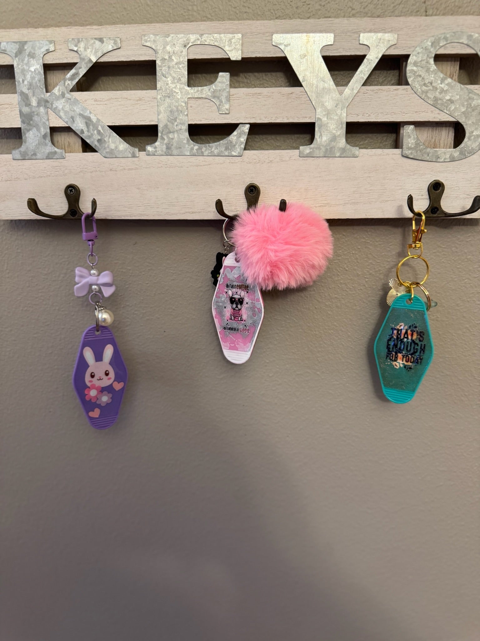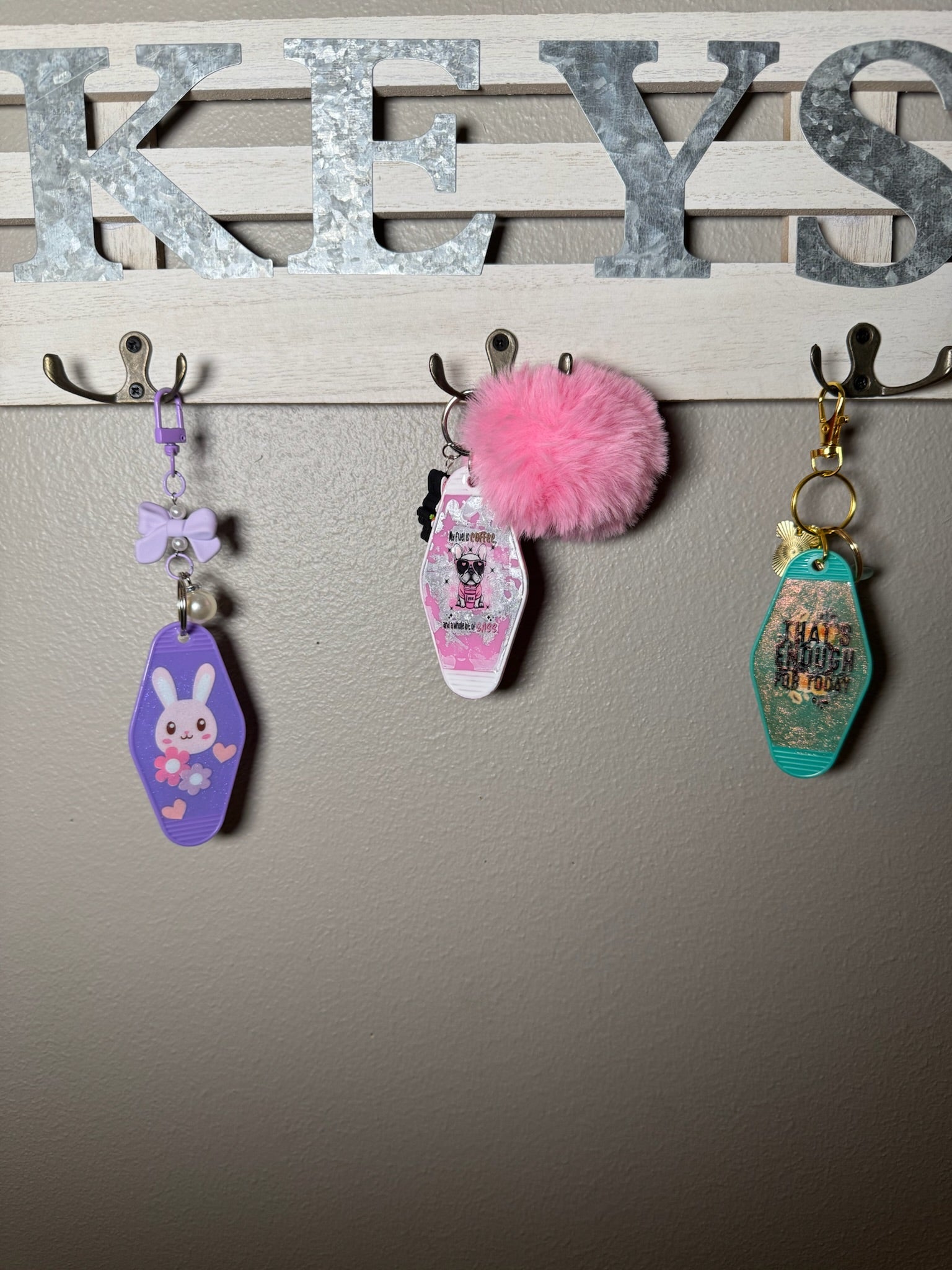 This vintage-inspired motel keychain is for those moments when you’re over it but still keeping it cute. Featuring a playful retro font, a touch of sparkle, and a bold teal hue, this keychain says "Feeling IDGAF-ish Today" on the front, while the back offers the perfect reminder: "That's enough for today." Because let’s be real—you’ve done your best, and that’s more than enough.