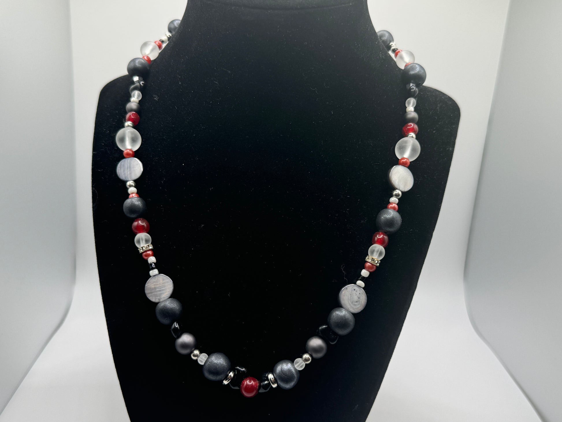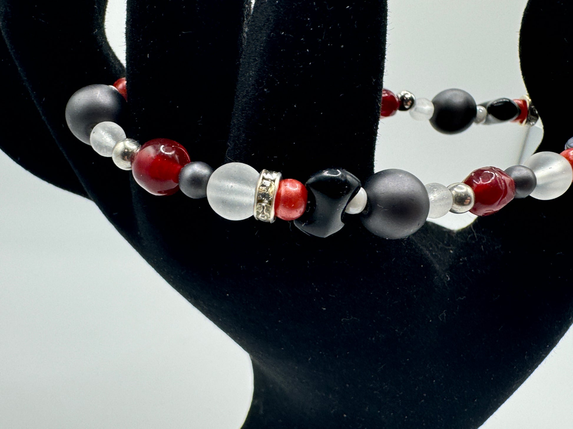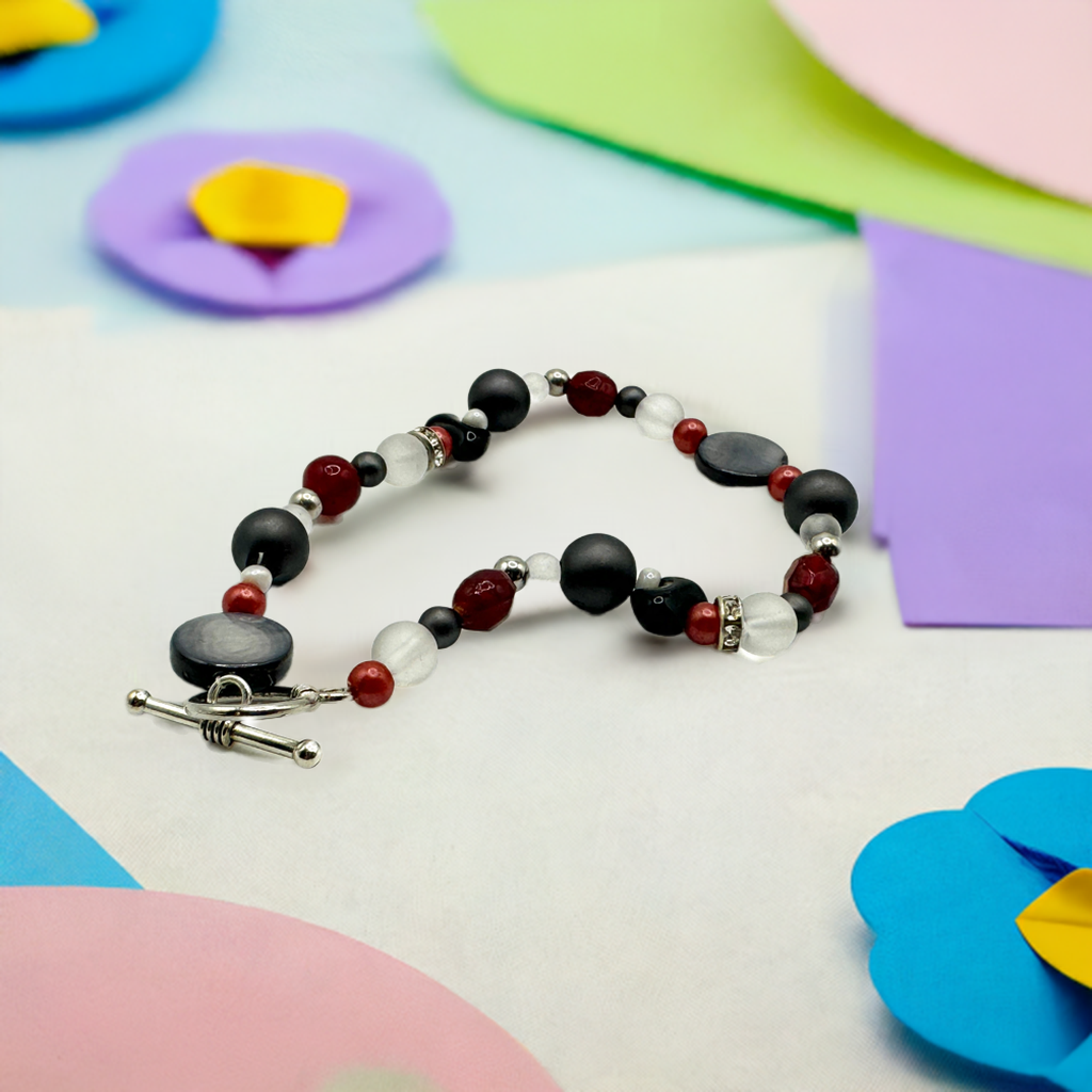 Elevate your style with the "Midnight Elegance" Jewelry Set, a stunning blend of sophistication and boldness. This exquisite set features a meticulously crafted necklace and matching bracelet, each adorned with a captivating mix of deep red, black, and frosted beads. The striking contrast of colors, highlighted by shimmering accents, creates a dramatic yet timeless look that effortlessly transitions from day to night.