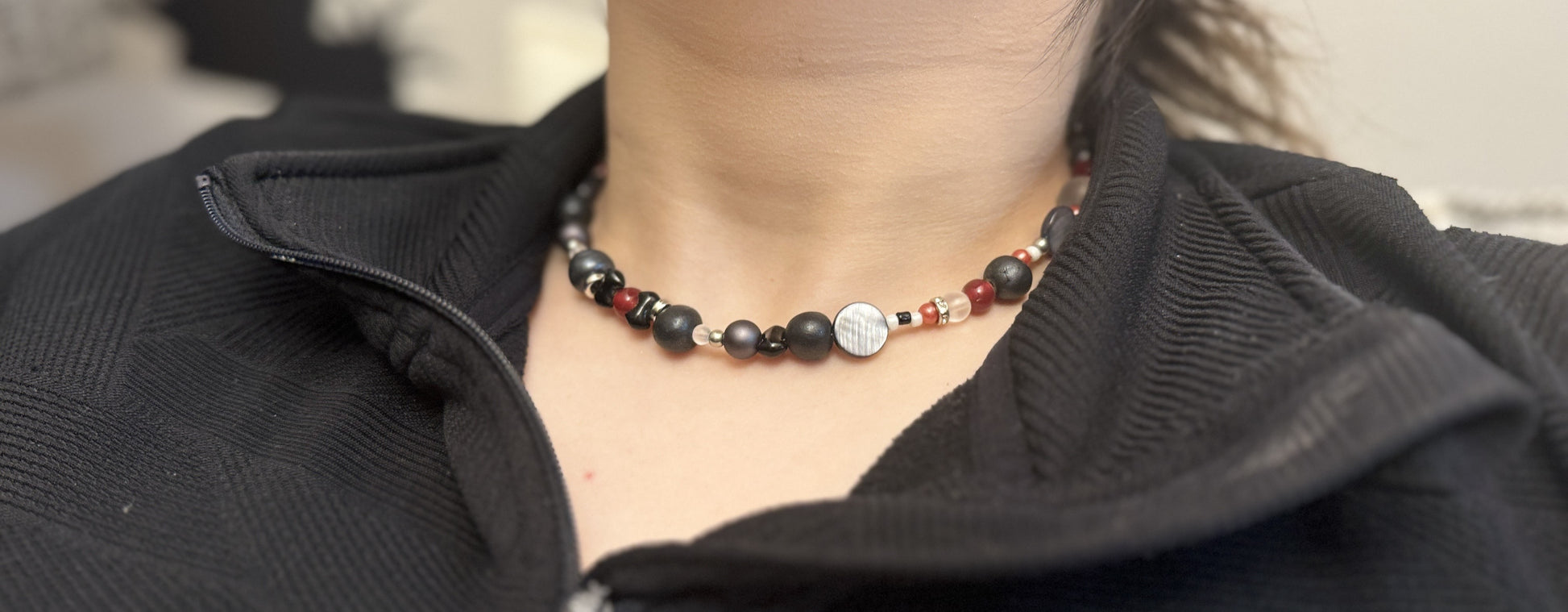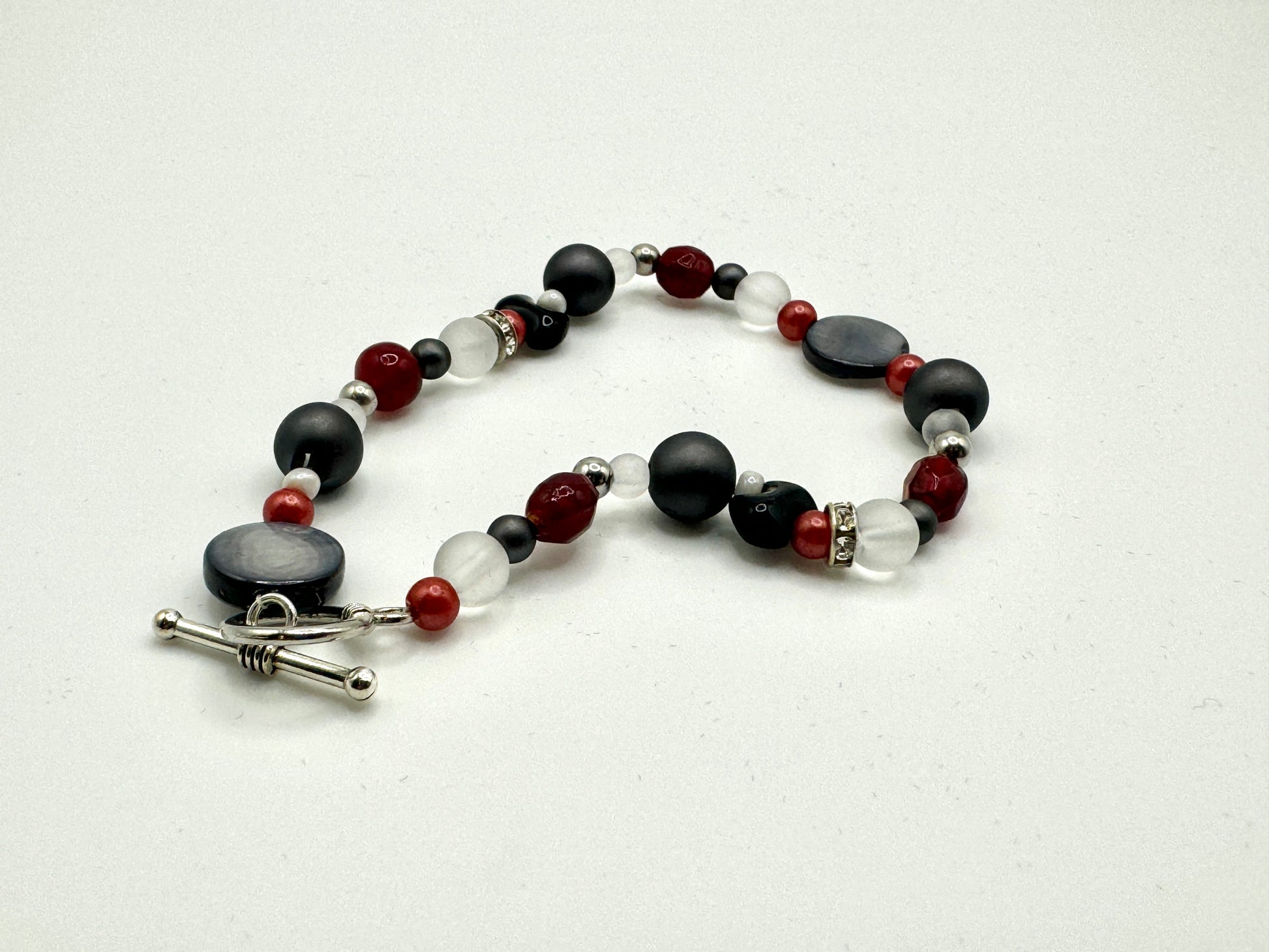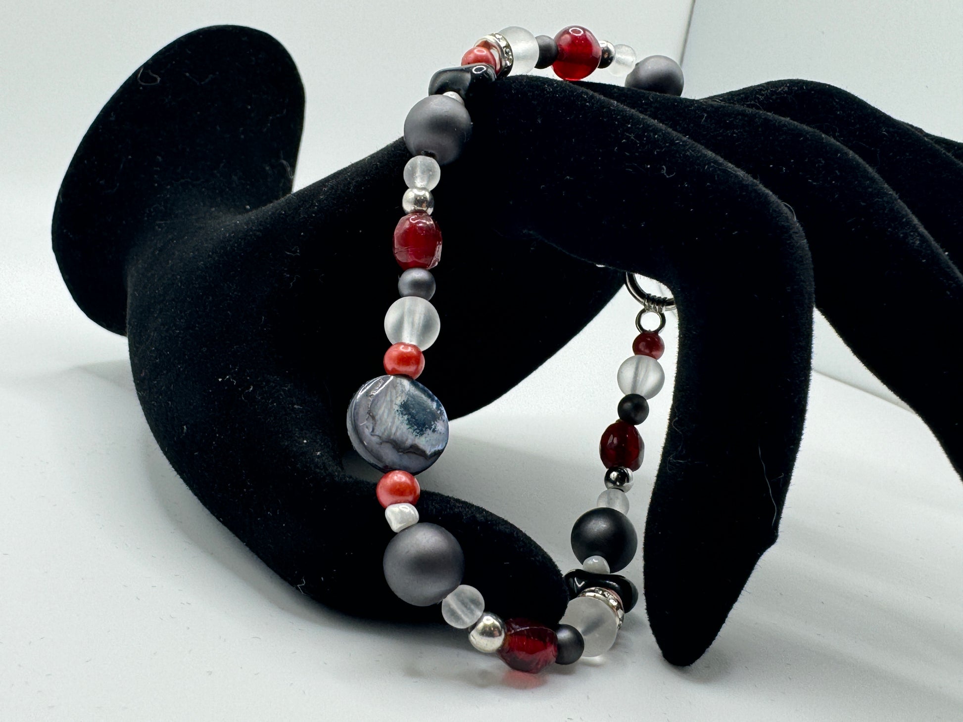 Elevate your style with the "Midnight Elegance" Jewelry Set, a stunning blend of sophistication and boldness. This exquisite set features a meticulously crafted necklace and matching bracelet, each adorned with a captivating mix of deep red, black, and frosted beads. The striking contrast of colors, highlighted by shimmering accents, creates a dramatic yet timeless look that effortlessly transitions from day to night.