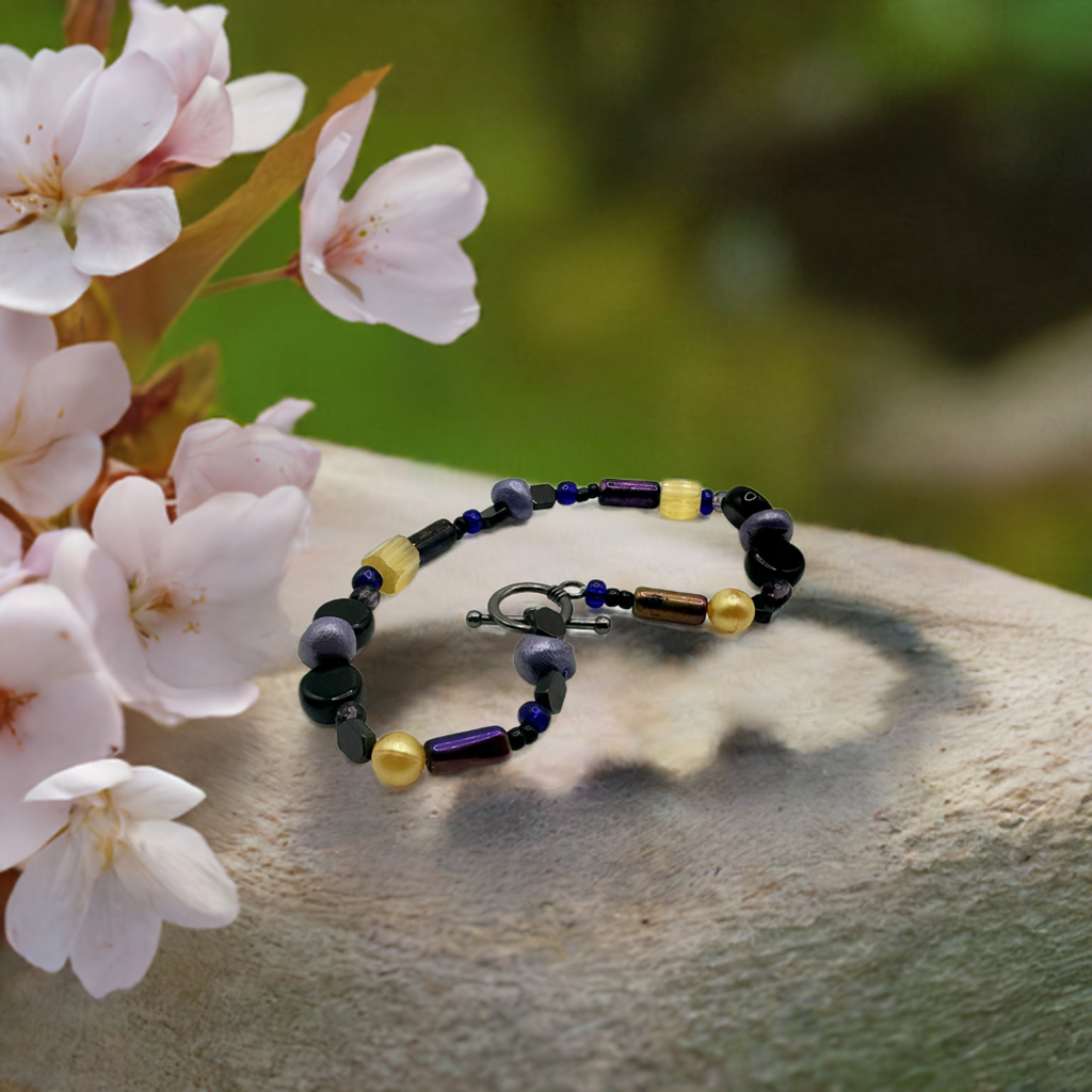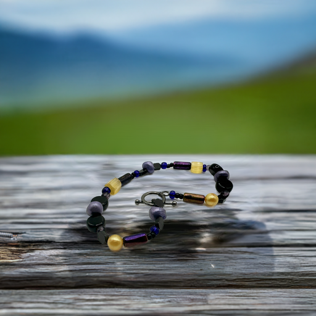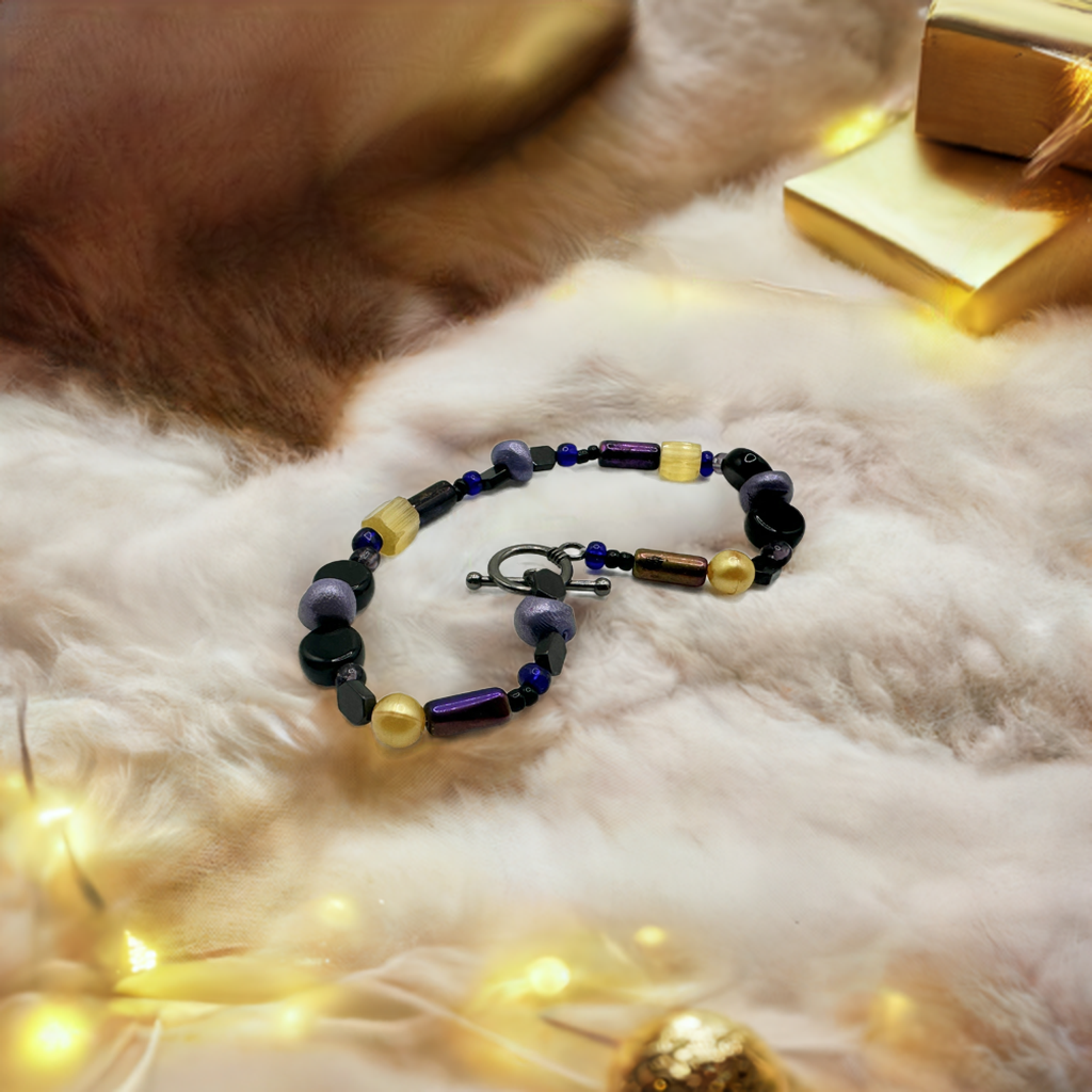 Elevate your style with the Mystic Gemstone Elegance Bracelet, a unique piece of handcrafted jewelry that effortlessly blends bold colors with intricate design. This stunning bracelet features an array of carefully selected gemstones, including rich purples, deep blacks, and warm golden hues, all strung together to create a harmonious balance of elegance and mystery.