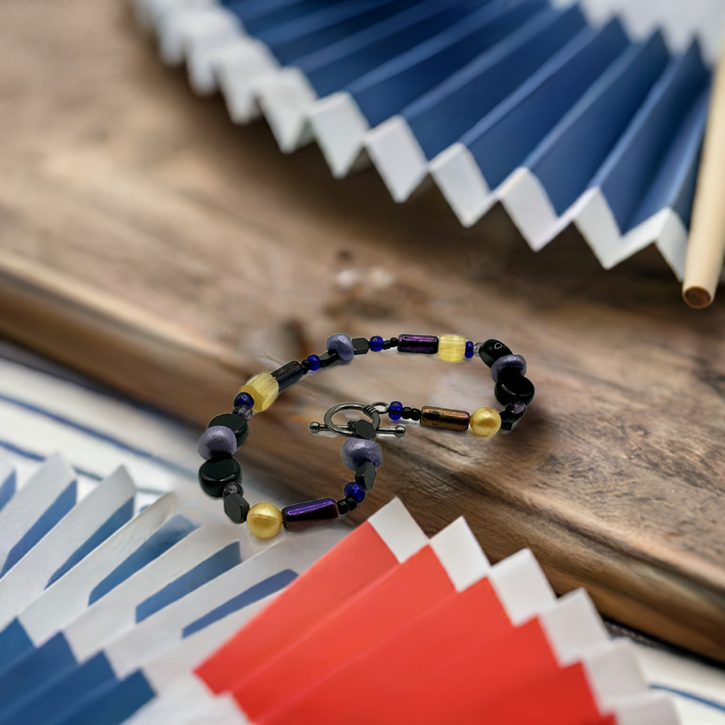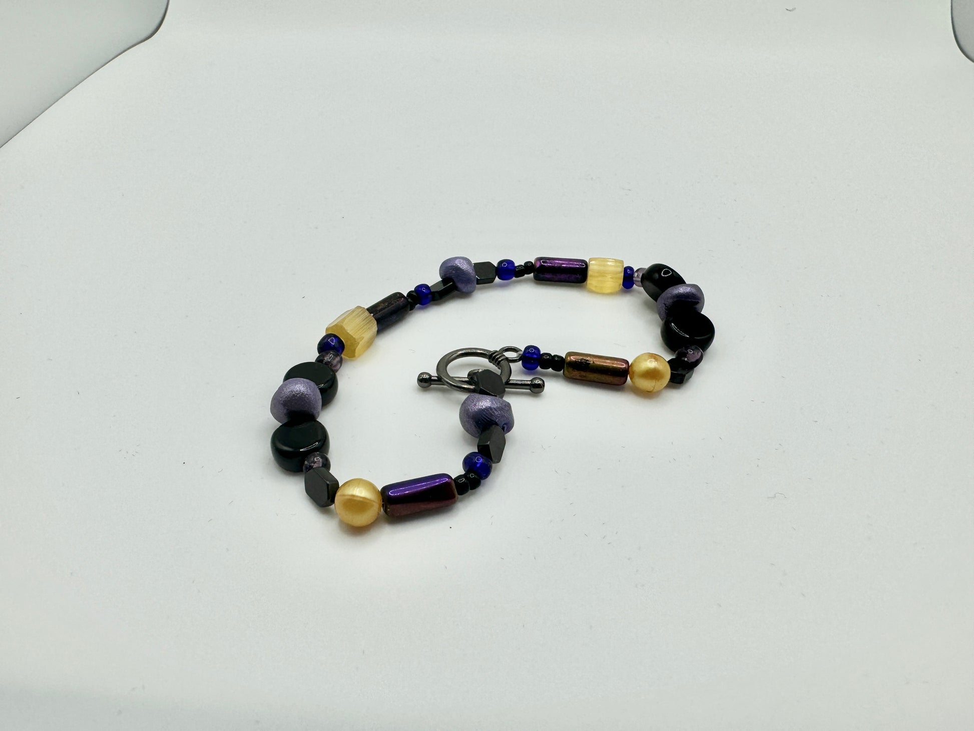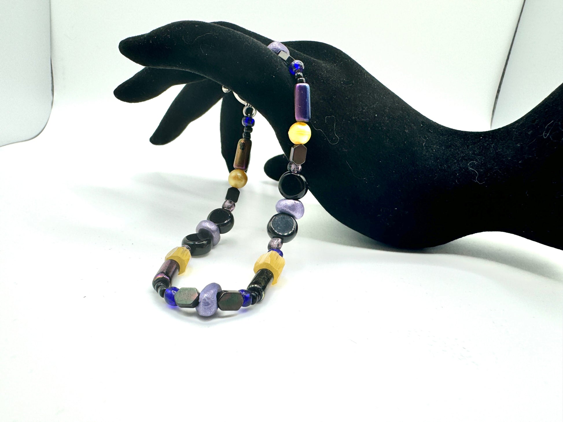 Elevate your style with the Mystic Gemstone Elegance Bracelet, a unique piece of handcrafted jewelry that effortlessly blends bold colors with intricate design. This stunning bracelet features an array of carefully selected gemstones, including rich purples, deep blacks, and warm golden hues, all strung together to create a harmonious balance of elegance and mystery.
