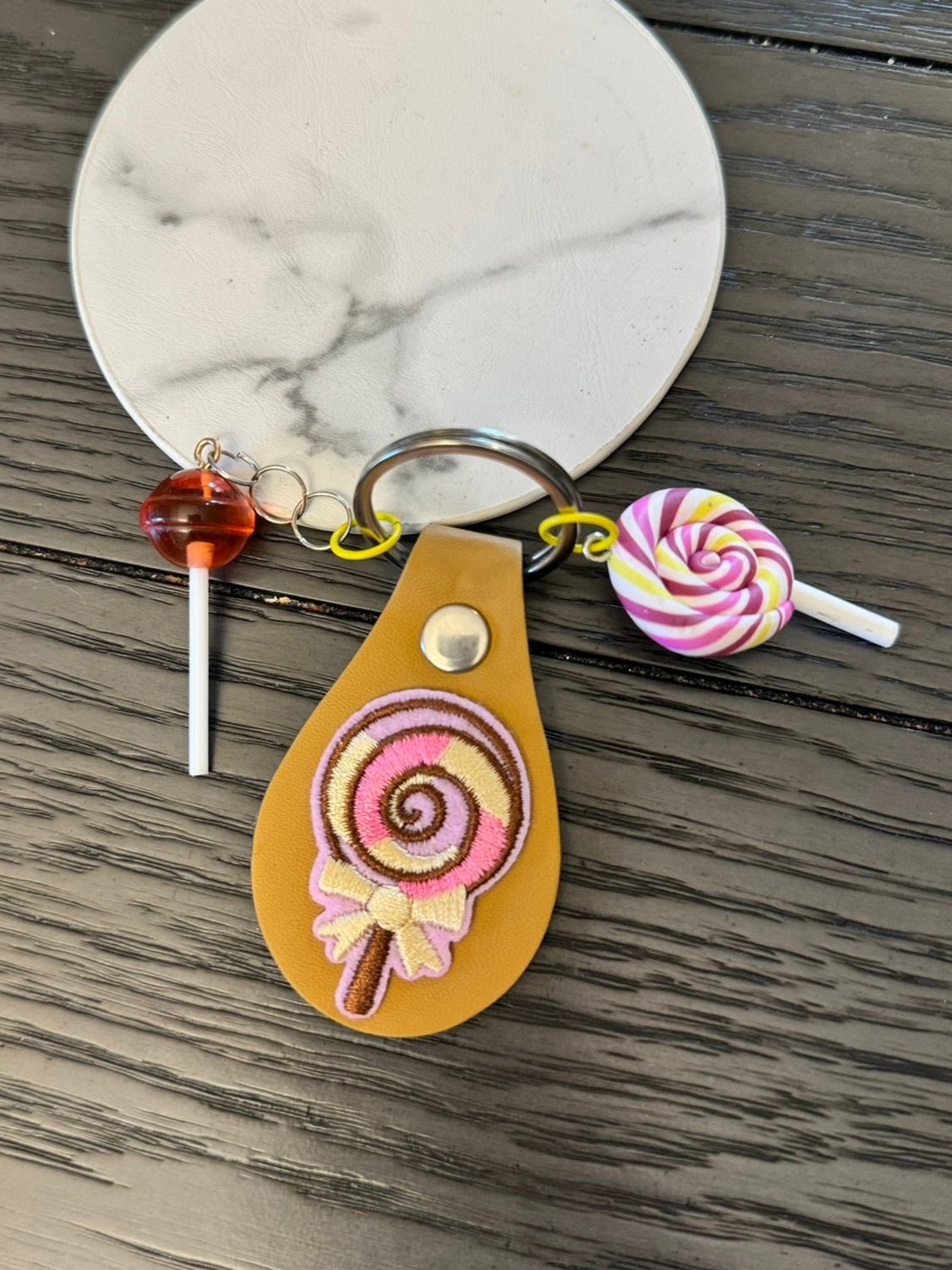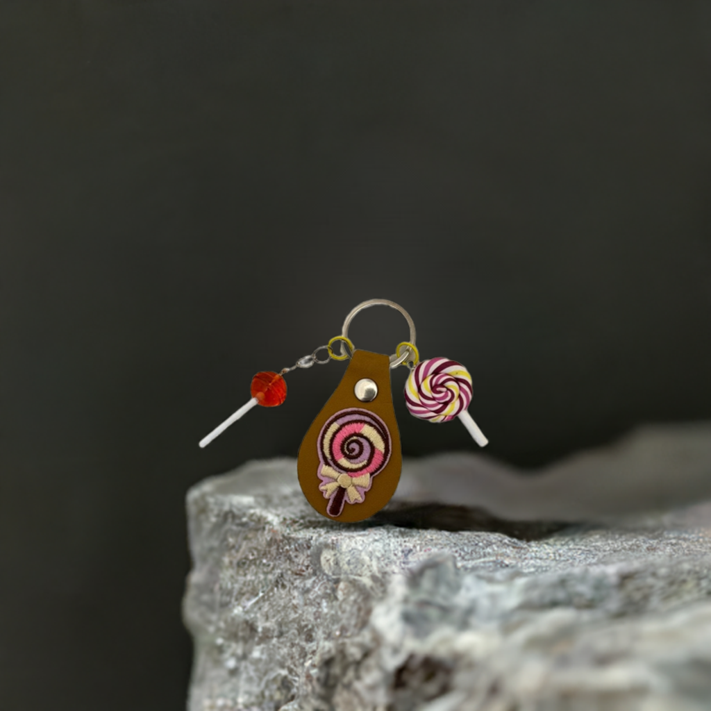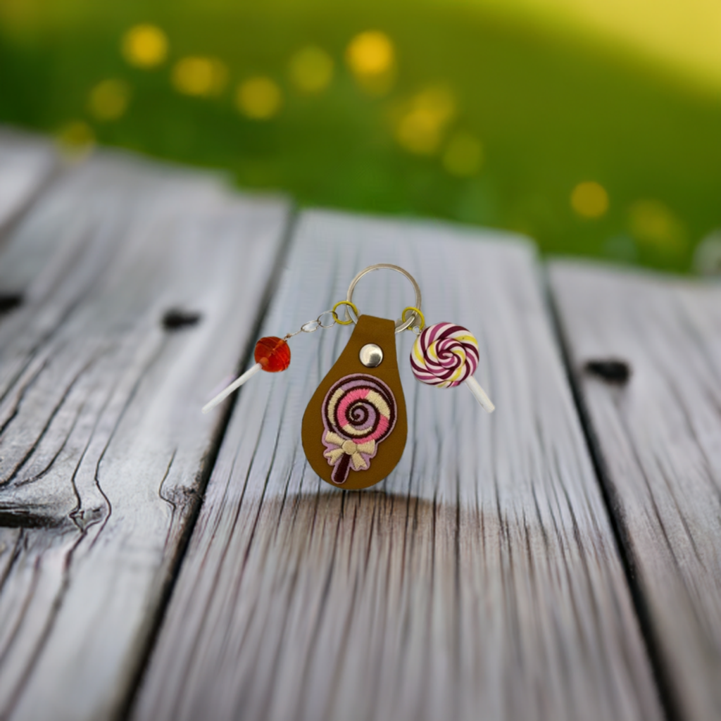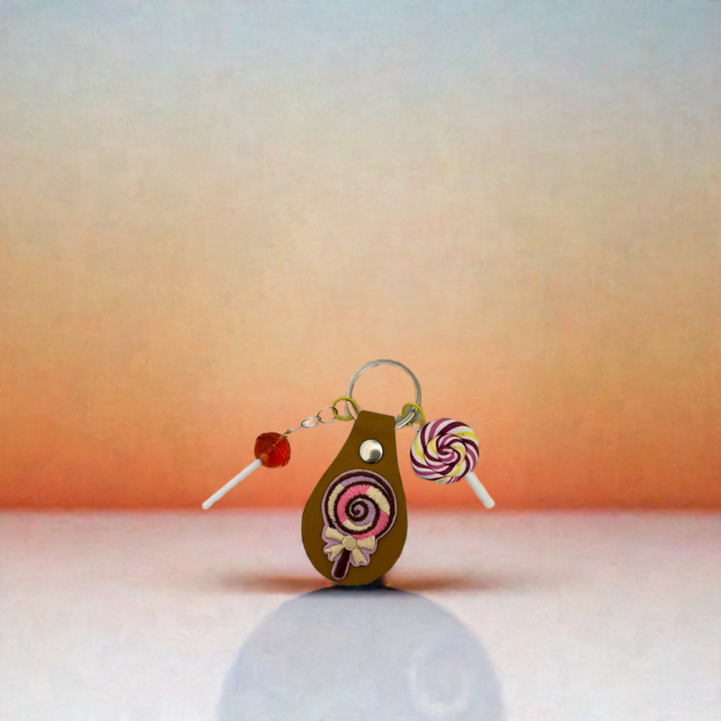 Add a touch of whimsy and sweetness to your everyday essentials with this delightful lollipop keychain charm. Crafted with meticulous attention to detail, this keychain features a vibrant, embroidered lollipop design on a tan leather base, complemented by two charming lollipop pendants—one with a pink and white swirl and another with a red bead. The sturdy metal ring ensures your keys stay secure while adding a playful pop of color to your accessories. Perfect for candy lovers and those who appreciate unique, fun designs, this keychain is both a practical and stylish addition to your collection.