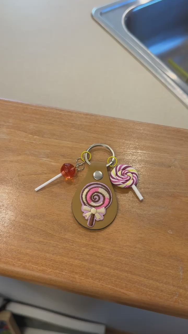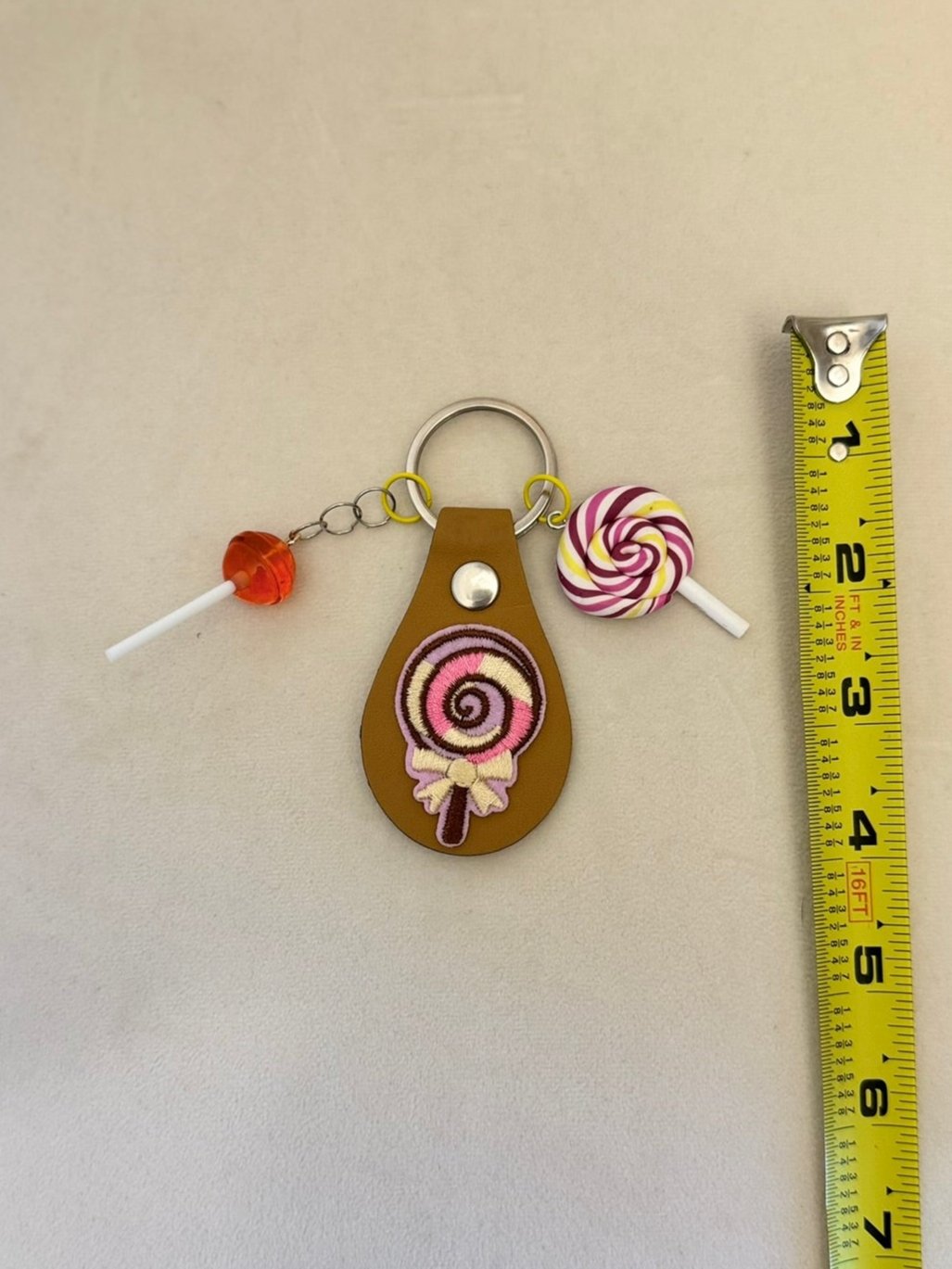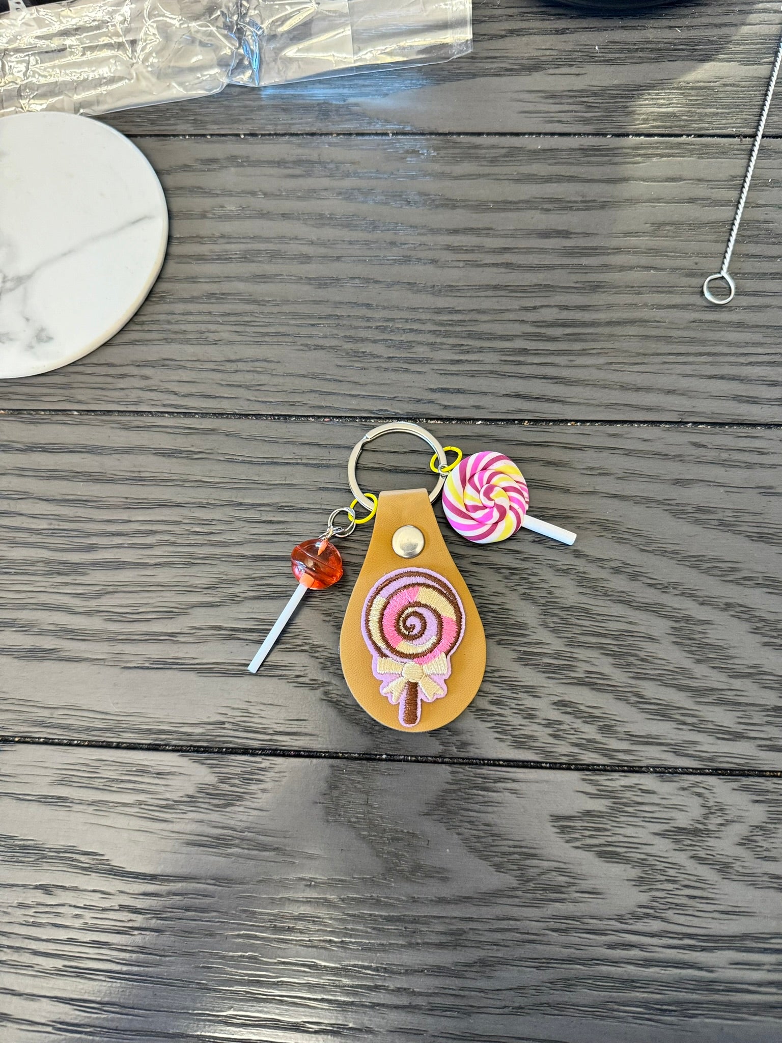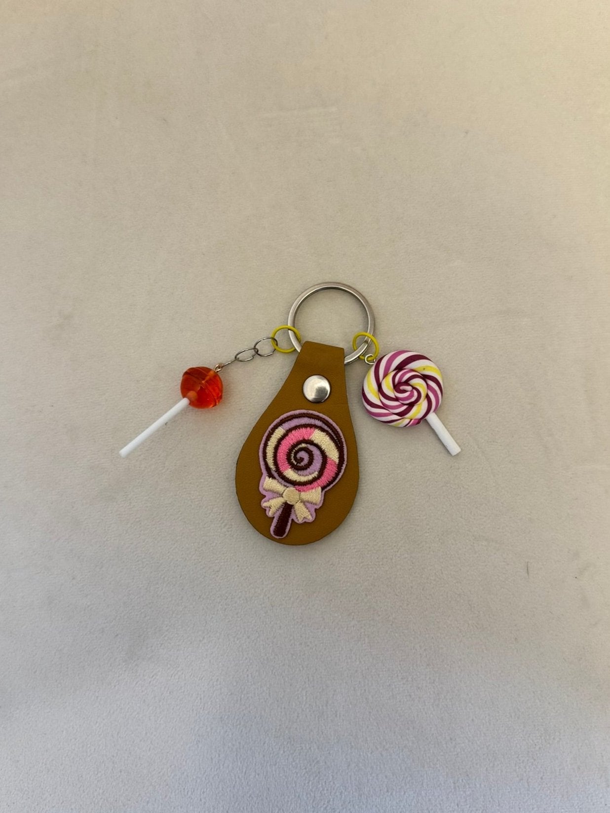 Add a touch of whimsy and sweetness to your everyday essentials with this delightful lollipop keychain charm. Crafted with meticulous attention to detail, this keychain features a vibrant, embroidered lollipop design on a tan leather base, complemented by two charming lollipop pendants—one with a pink and white swirl and another with a red bead. The sturdy metal ring ensures your keys stay secure while adding a playful pop of color to your accessories. Perfect for candy lovers and those who appreciate unique, fun designs, this keychain is both a practical and stylish addition to your collection.